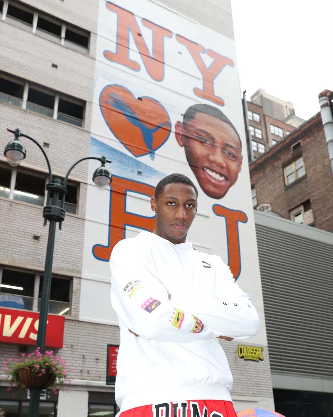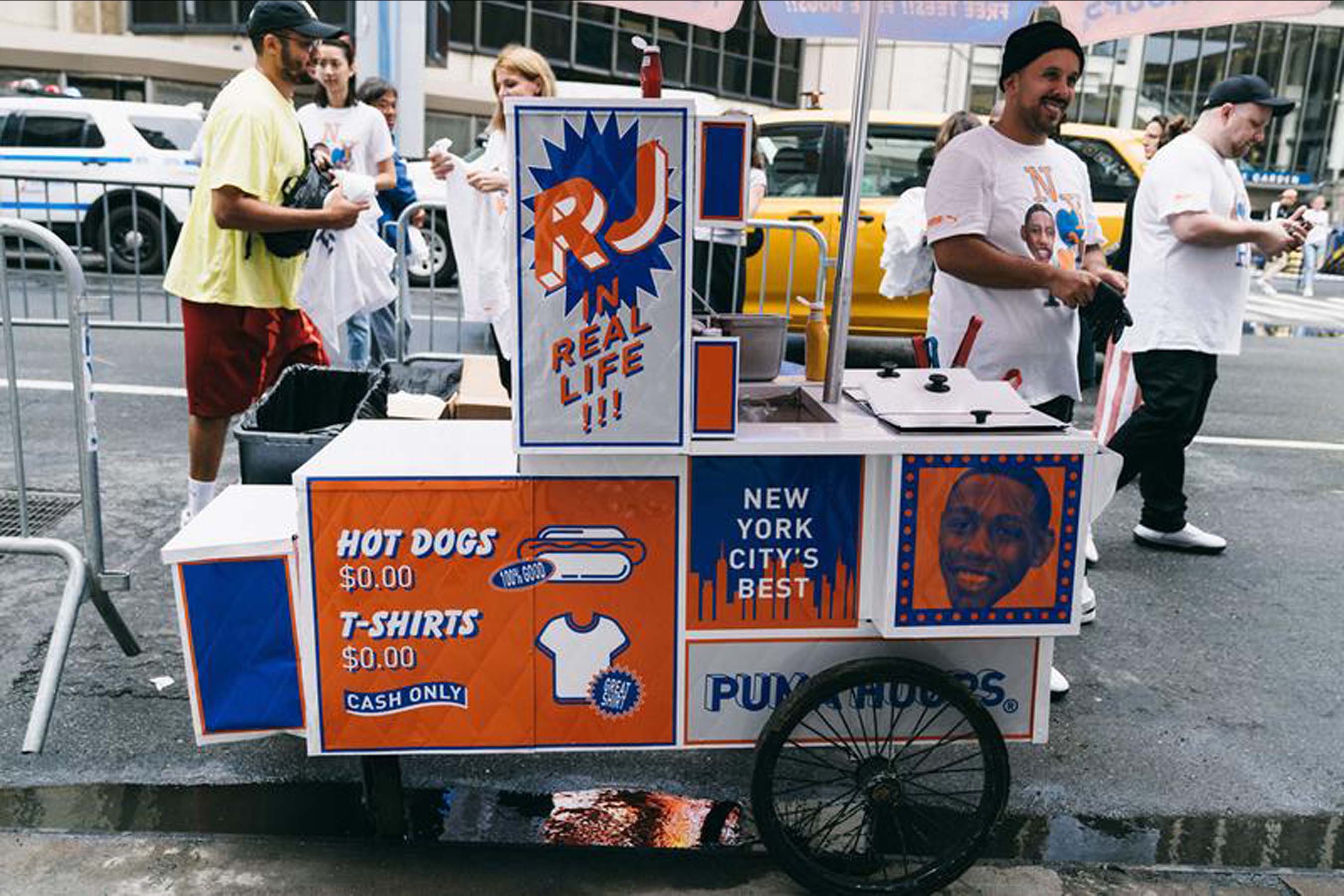 New York Knicks' player, RJ Barrett, signed a multi-year endorsement deal with Puma. To announce the deal a mural, repurposing New York City's iconic "I Heart NY" slogan, was painted on the face of a building on 31st Street, opposite Madison Square Garden, declaring "NY Heart RJ" in Knicks colours. To celebrate the signing, RJ Barrett met with local Knicks fans and handed out T-shirts featuring a similar "RJ Heart NY" graphic at a Puma-branded hot dog cart under the mural in New York City.
